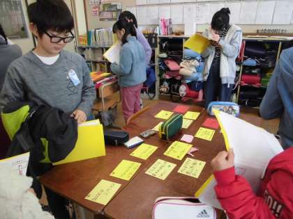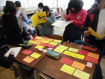 インタビューカードは,みんなで話し合って交流する前に,互いに見合う時間を取りました。いろいろなカードを見る中で,自分の家族がこたえてくれた言葉と同じキーワードが見つかったり,新たな家族の思いにふれたりすることができました。