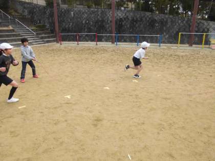 大縄を使って,じゃんけんをしたり,八の字をしたりしてあそびました。初めて八の字が跳べた人もいて喜んでいました。縄の回し方も上手になりました。