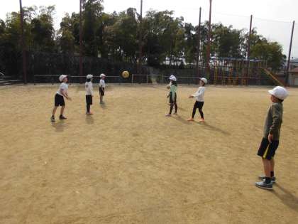 ボールを使って,エックスという遊びやテンカ,天大中小などのいろいろな遊びをしました。投げ方や受け方に気をつけながら楽しむことができました。