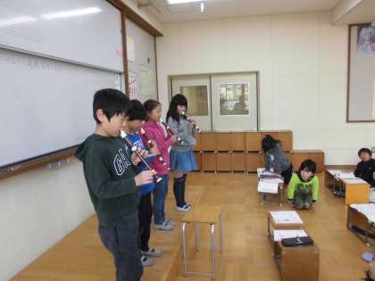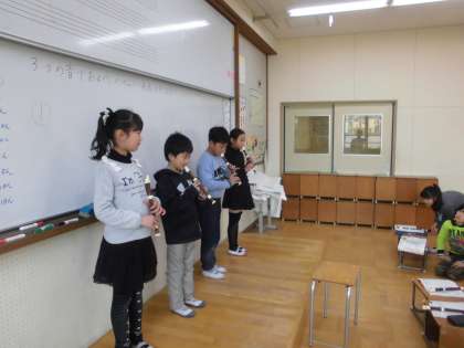 音楽科の学習で,拍の流れにのっておはやしの旋律をグループ毎にリコーダーで演奏しました。