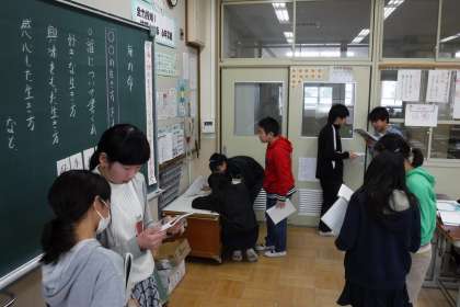 国語科では「海の命」をい学習しています。今日は登場人物の中から一人を選び,その人物の生き方についてまとめたものを友達と交流しました。同じ人物の生き方についてまとめたものでも,一人一人とらえ方が違ったりなど,交流してみて気付くことがたくさんありました。