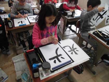 書写の時間に一年間の学習のまとめの「光」という漢字を書きました。縦画・横画・点・左はらい・曲がり・はねと学習したことをふり返って,心を落ち着けて毛筆のまとめができました。