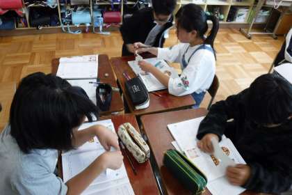 算数科では対称な図形を学習しています。今日は鏡を立てて見える形についてグループで調べました。指定された形が見えるためには鏡をどのように立てればよいか,友達と話し合いながら考えることができました。