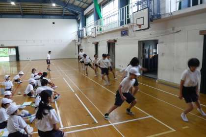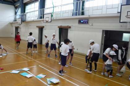 今日は1年生と6年生で新体力テスト(上体起こし・反復横とび・立ち幅とび・長座体前屈)を行いました。1年生と6年生でグループを組み,まずは6年生がお手本を示し,その後に1年生が実施しました。1年生にとっては初めての種目ばかりですが,6年生は優しく,丁寧に教えてあげることができていました。