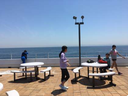 おのころパークでは昼食後にグループ活動を行います。予定より早く着き,意味沿いのデッキでゆっくりしています。
