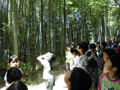 今日は総合的な学習の時間「たけのこはかせになろう」の学習で,地域の竹林を見に行きました。