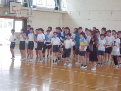 「オオえもん」と題し,ドラえもんに変身した6年生たちも登場。楽しいリズムの歌とダンスで,全校生徒を楽しませてくれました。