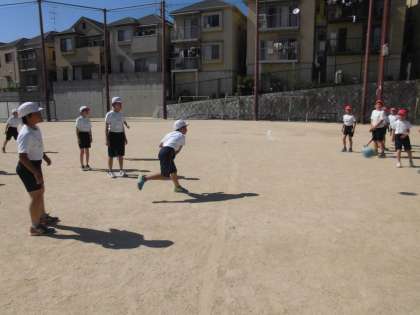 屋外スポーツクラブでは,ドッジボールをして楽しみました。みんなで楽しむことができました。次回はラケットベースを行う予定です。