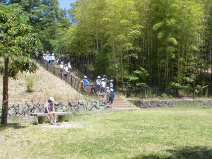 散策の後は,竹林公園のとなりの子どもの広場でお昼ご飯を食べました。子どもたちはそれぞれ友達と楽しそうに,おうちの人に作ってもらったお弁当を見せ合いながら食べていました。