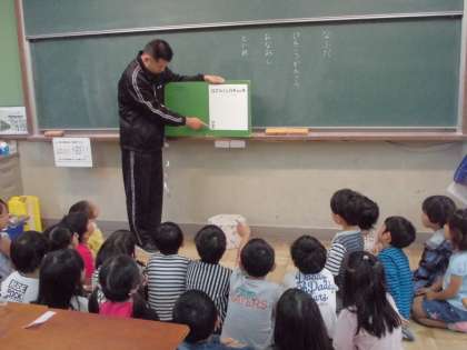 お話を知っている人もいたけど,「先にお話は言ったらだめ!」と,ちゃんとルールを決めた子どもたち。先生からの楽しい読み聞かせを,静かに聞いていました。