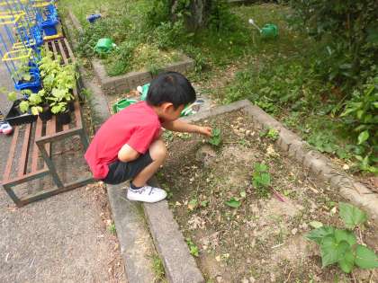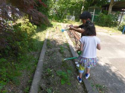 ひまわり学級ではさつまいもを育てています。「大きな,大きなさつまいもになーれ。あまーい,あまーいさつまいもになーれ。」と言いながら水やりをしています。土の中で栄養をいっぱい吸収して,大きく育ってほしいです。