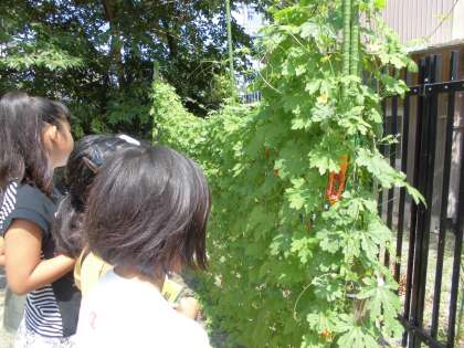 夏休み中にぐんぐん成長したツルレイシの観察に行きました。