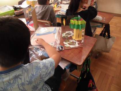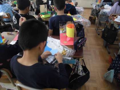 いろいろな材料を使って,鏡に映る世界を楽しんで作っていました。完成が楽しみです。