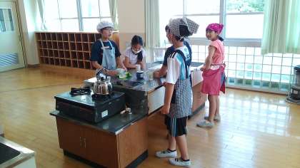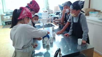 きゅうすに人数分の茶葉を入れ,沸かしたお湯を入れてて,人数分の湯のみ茶碗に分量やこさが同じになるように注ぎました。みんなで楽しく飲む様子が見られました。