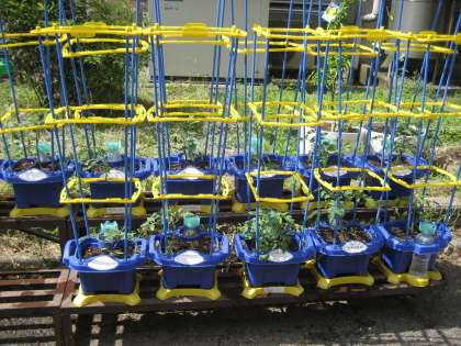 ミニトマトが大きくなってきたので,今日,支柱を立てました。