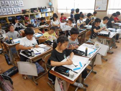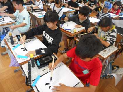 書写の時間に「道」を書きました。一筆一筆丁寧に,力を入れたり弱めたり。考えながら書き上げました。