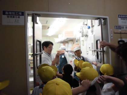 スーパーマーケットの見学では,普段入ることのできないバックヤードも見学させてもらいました。大きな冷蔵庫や冷凍庫があり,びっくりしました。お肉や魚を加工する場所もあり,子どもたちは興味津々でした。
