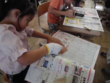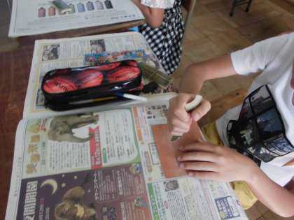 竹を使って,鉛筆立てと四竹を作っています。四竹とは,踊りに使う鳴り物です。今回は,紙やすりを使って竹を削っていきました。つるつるに仕上がりました。