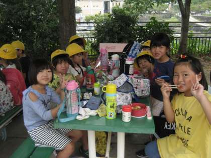 待ちに待ったお弁当の時間です。みんな大喜びで食べていました。