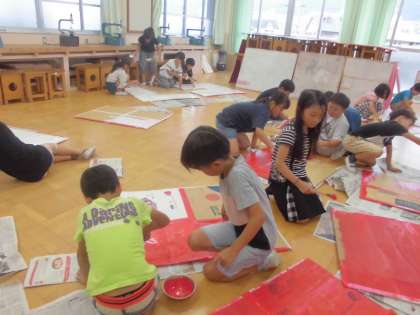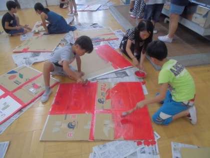 3・5年兄弟学年種目「大枝はどっち?」の準備をしています。大きなダンボールに赤と白を塗っていきます。この段ボールを使って競技を行います。明日は初めての練習をします。子どもたちはとても楽しみにしています。