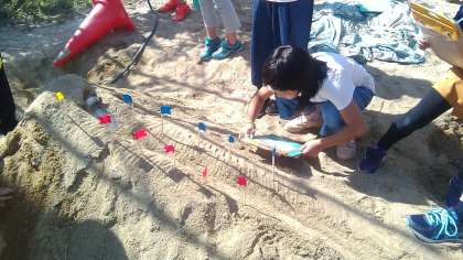 砂場で人工の川を作り,その川岸に旗を立てていました。