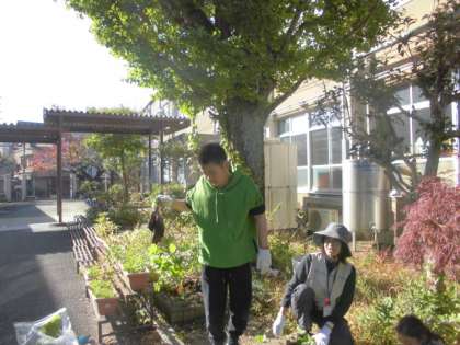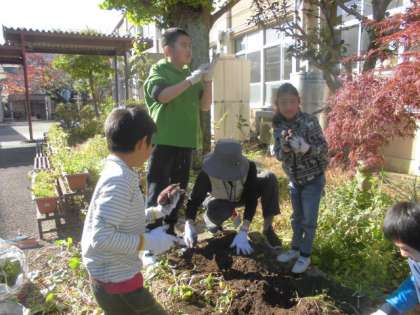 6月に植えたサツマイモを収穫しました。つるを引っ張ると大小大きさの違うサツマイモが,たくさんとれました。「宝探しみたいだね。」と声をかけると,深く掘ってサツマイモの頭が見えると,大喜びで土をのけて掘り出していました。次回は,収穫したサツマイモを調理して食べるのが楽しみです。