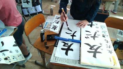 書写で書初めをしました。いつもの半紙と違い,画仙紙を使うので字のバランスをとるのが難しかったです。お手本を見ながら,一筆一筆心を込めて書いていました。