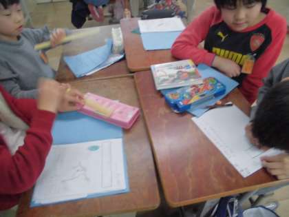 今まで学習してきた大枝の竹や柿のこと知ってもらうために,クイズラリーをします。今日は,どんなクイズにするかグループで話し合いました。全校のみんなに大枝の良さを伝えられるようなクイズラリーにしたいと思います。