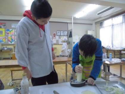 とれたての大根を洗って,おろし金でおろし大根にして,ウインナーやエビを混ぜて焼きました。ほくほくと焼けた大根もちを,みんなでおいしくいただきました。