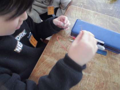 乾電池と豆電球をつないであかりをつける学習をしています。今日はソケットなしであかりを付けられるか実験しました。豆電球の仕組みを考えながら実験に取り組んでいました。すべてのグループであかりを付けることができました。