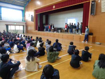 児童朝会で図書委員会と放送委員会の子どもたちが発表をしました。