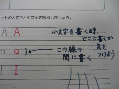 4本の線のどこに書くとよいのか気を付けて書きましょう。特に,小文字を書くときには,どこに書くとよいのか,お手本をよく見て書きましょう。