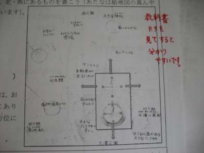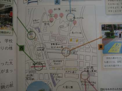 「東西南北」の方位を覚えましょう。ほとんどの地図は,上側が「北」になっているので,上が「北」,下が「南」,右が「東」,左が「西」と覚えておくといいですよ。