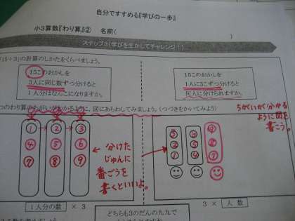 今日の算数の課題も割り算ですね。同じ「15÷3」という式でも,分け方が違います。写真のように,おかしを配った準備番号を書くと,分かりやすいですよ。図を書いて考えてみよう。
