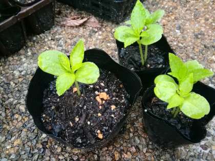 本葉が出てきたら,一つずつに植え替えます。