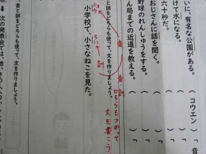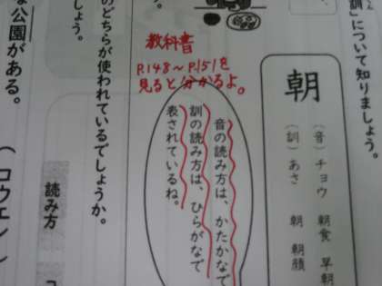今日の課題の国語プリントですが,「漢字の音と訓」になっています。教科書のP,148〜151を見ると,「音」は「カタカナ」,「訓」は「ひらがな」で書いてあるので,それを見て問題を取り組んでください。