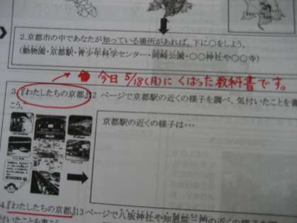 今日の社会のですが,これまでは社会の教科書を見て取り組んでいましたが,今日の課題は,本日(5月18日)に配布した,「わたしたちの京都」を見て取り組みます。