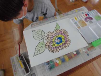 4年生になって初めての図工の学習です。絵の具の正しい使い方を確認し,4つの色だけをつかっていろいろな色づくりに挑戦しました。あじさいの花に丁寧に色をぬっていきました。世界に一つだけのあじさいが完成です。