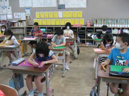 カッターナイフを使って今日は,窓を作りました。前回よりも,カッターナイフの使いかたにも慣れ,それぞれ表したい形を作りました。次は,紙を裏に貼り合わせて,絵合わせゲームにします。完成して遊ぶのが楽しみです。