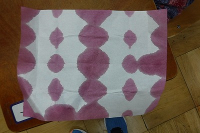 1学期から大切に育てていたアサガオの花を使って,色染めをしました。和紙をいろいろな形に折り,少しずつ色をつけていくといろいろな模様になりました。きれいな模様が出来上がるたびに「先生できた!」と楽しそうな子どもたちでした。