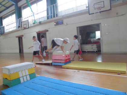 子ども達が,「先生,体育いつするの」と,よくたずねてきます。みんなでかけっこをしたり,鬼ごっこをしたり。また,転がしドッジボールや器械体操をしています。体育の時間を楽しみにしているようです。今日は,跳び箱を学習しました。跳び箱のこつは,手を遠くにつくこと。前のめりの姿勢になることです。今日は,そのことを練習をしました。