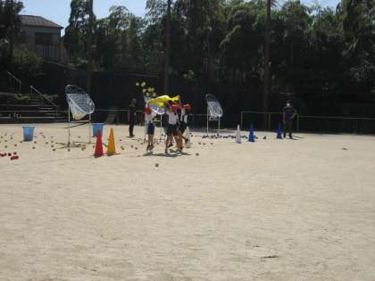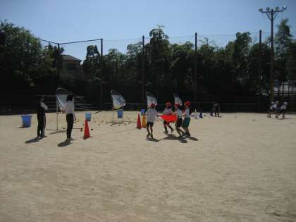 3,4年生の団体競技の練習が始まっています。4人で協力して,競技をします。