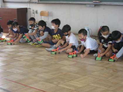 理科の時間に「風やゴムの力」の学習をしました。今回は,ゴムの力です。ゴムをまく回数をどうすれば,車が遠くまで進むのか実験をしながら,確認しました。