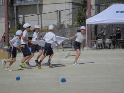 1年生の団体競技では,大玉を落とさないように上手に運んでいました。