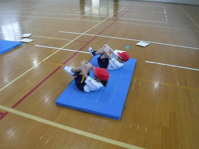 今日から体育では「マットあそび」を始めました。マットを準備するところから始まり,「ゆりかご」「手足歩行」など体慣らしの仕方を確認しました。ころころあそびの「まるたころがり」にチャレンジし,真っすぐ転がれているかなど,ペアで確認し合いながら活動しました。