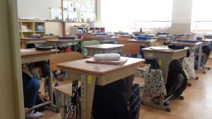 すぐに教室の机の下に入り,自分の身の安全を守りました。