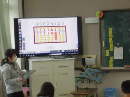 大型テレビにそろばんを映し,学習を進めています。よく見えるので確認しやすいですね。
