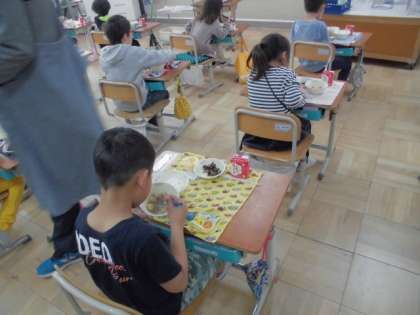 今日は京都産和牛を使った肉じゃがでした。給食調理員さんも腕によりをかけて調理しました。とてもおいしそうに食べていましたよ。