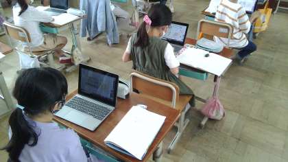 算数科の学習で「たし算の筆算」に取り組んでいます。自分で筆算に取り組んだあと,デジタル教科書で計算の仕方を確かめています。くり上がりがあっても一の位から順番に計算すれば解くことができると分かりました。