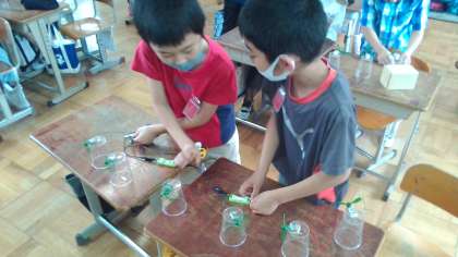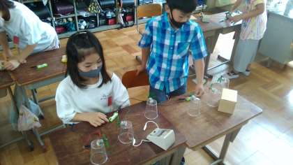 理科「電池のはたらき」の学習を生かして,いろいろな回路を作り,モーターが回るかを実験して確かめました。直列つなぎや並列つなぎ,電池の個数やモーターの個数を変えて試しています。いろいろなつなぎ方を試してみて,気付くことがたくさんありました。